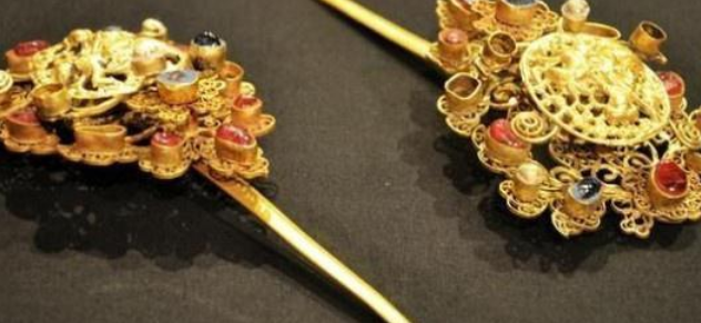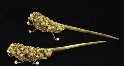 说完,男子就从身旁的小木盒里轻轻取出一对金簪,只见这是一对金光闪闪的黄金制品,上面更是镶嵌了一些宝石,显得非常的雍容华贵。