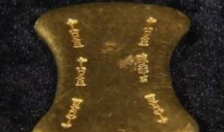 专家顿了顿,继续说:你看,它呈中间细两头宽的束腰板状,两头也平整,中间稍有凹陷。而且金锭上面也有人名、铺名、成色等文字,是很好确认的。另外看看这金锭不是很平整,有很多气孔,也是符合当时的鉴定标准的。