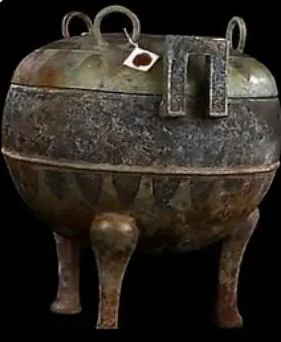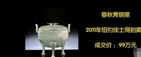 其次,整个鼎是圆球状,而且它两个附耳,整个身上满都是带三层的花纹,纹饰基本上都是蟠螭纹,也证实了它的年代。最后呢,2011年的时候,纽约佳士得有一个类似的鼎,成交价是90多万,所以大概也可以估出你这个鼎的价格了,远远超过40万。