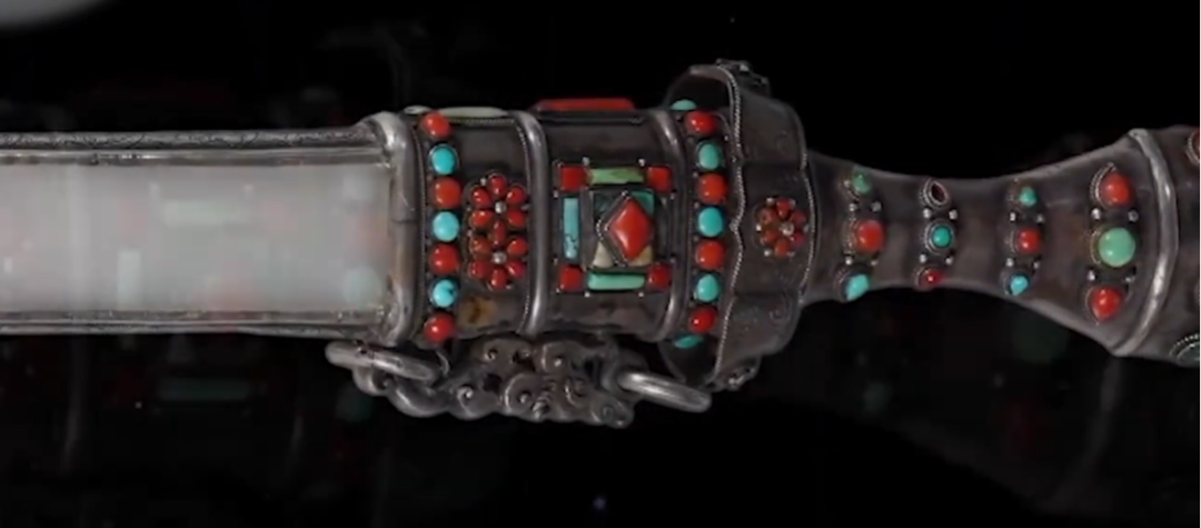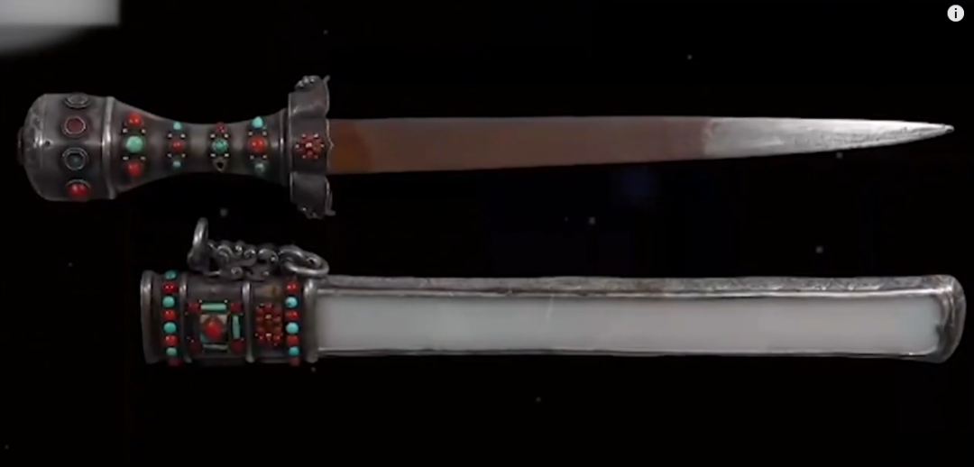 等到大家渐渐安定下来,专家才继续补充说:“这是一把短刀,并且是单面刃,这种配刀的装饰性很强,最大的特点就是剑鞘上镶着两块和田玉的玉板,边上白的是白银。整个刀刀柄镶嵌了很多珠宝,都是比较很珍贵的。