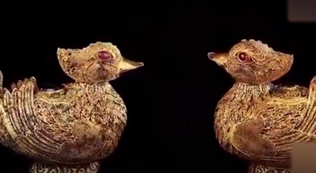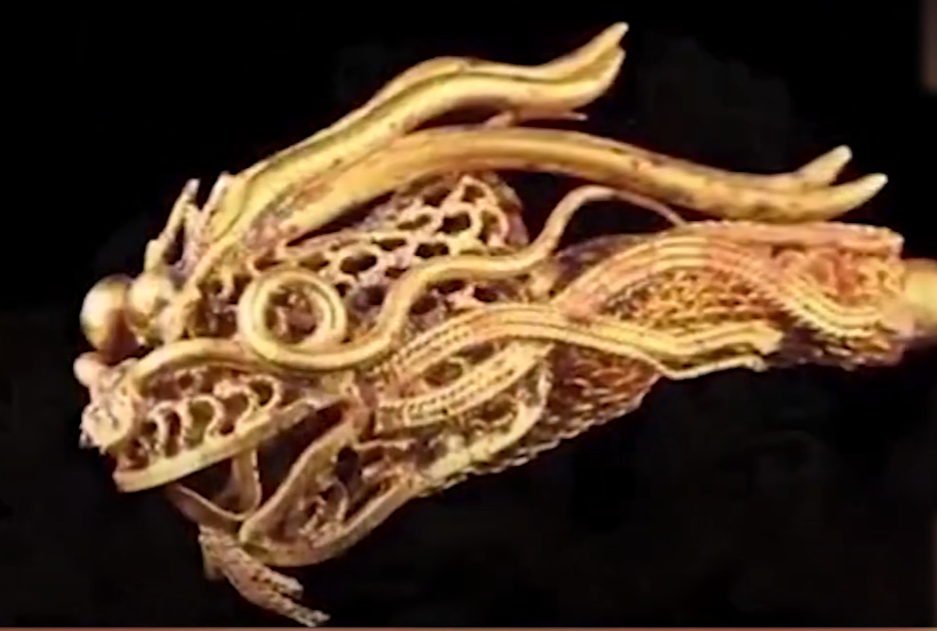 这件男士束发冠上面的龙用金丝堆垒工艺焊接成镂空状有立体感,这是只有皇子皇孙才有资格佩戴的,很明显两件就是一对,应该是一对少年夫妻的,两个鸳鸯也是制作精美,惟妙惟肖。”