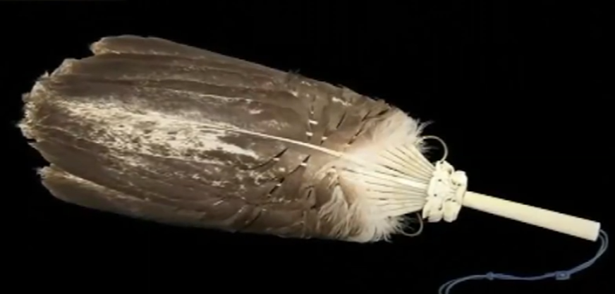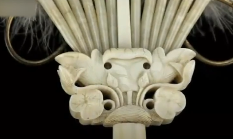 专家也不卖官腔了,接着说:这把扇子的扇柄是用象牙制作的,扇柄的上面雕出了一个荷叶形状,这应该是海马象牙。上面是由12只羽毛制作而成,这确实是大雕翅膀上的羽毛叫做雕翎。