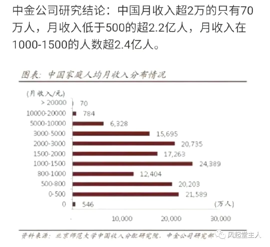 北京师范大学收入分配研究院的研究数据显示,14亿国人中,月收入在5000元以下的有13.2824亿人,占总人口的94.87%;月收入5000-10000元的有6328万人,10000-20000元的有784万人,20000元以上的仅有70万人。