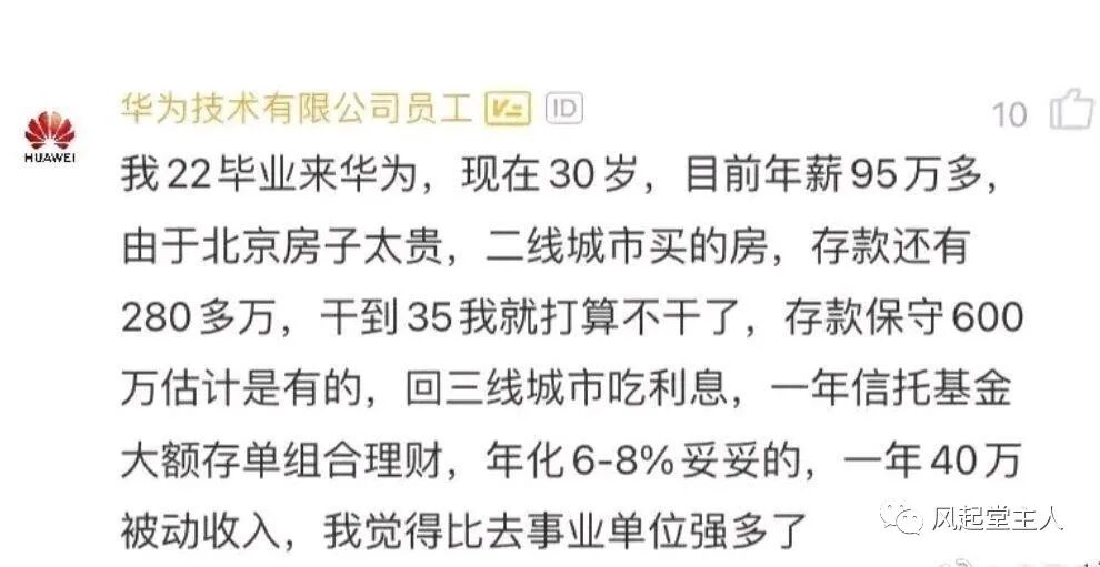 这就意味着,即使在华为这样的顶流企业,如果不是天才少年,至少5年左右才能达到年薪百万,再攒上10年,也才能在北上广深买上一套属于自己的房子。如果再算上吃喝拉撒、娶妻生子等各项开销,时间还要更长。