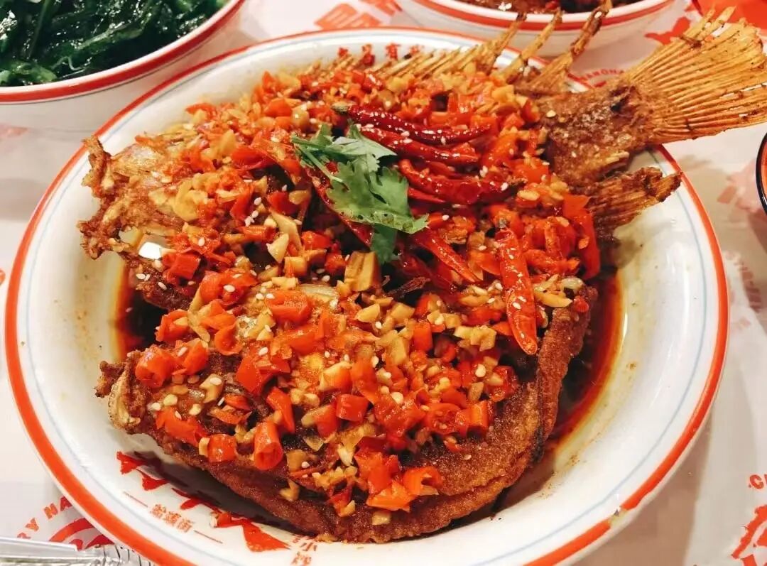 这是江西南昌特色菜品,别的地方没有这道菜,这道菜其实是将鲜活的鱼清洗干净后,放入锅中进行油炸,然后在将蒜头,朝天椒,辣椒干等各种食材调味后盖在鱼身上。