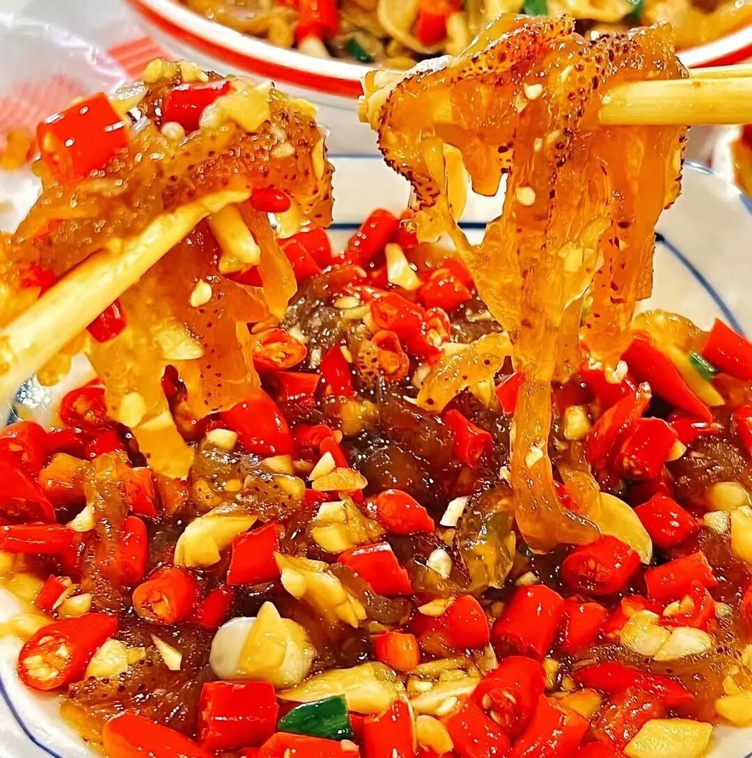 这道海蜇皮的做法,如果福建人和广东人看见了,都要暗自懊悔:暴殄天物。福建人和广东人对于海蜇皮的做法是凉拌清淡口味,但是隔壁的江西却不是这样,反而是将其做成了香辣口味,至于食材的本味,在江西人而言,不如吃辣更重要。