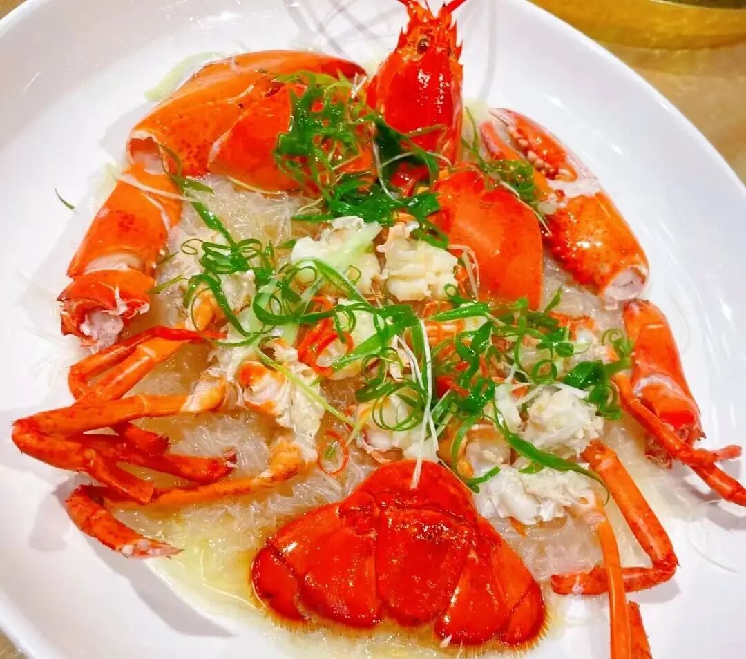 龙虾个头大,肉很足,肉质鲜嫩,口感爽脆,能吃出龙虾的新鲜味道,鲜红的色泽让这道菜品的卖相很高,龙虾底部放了不少的龙口粉丝,味道香浓,很是美味。