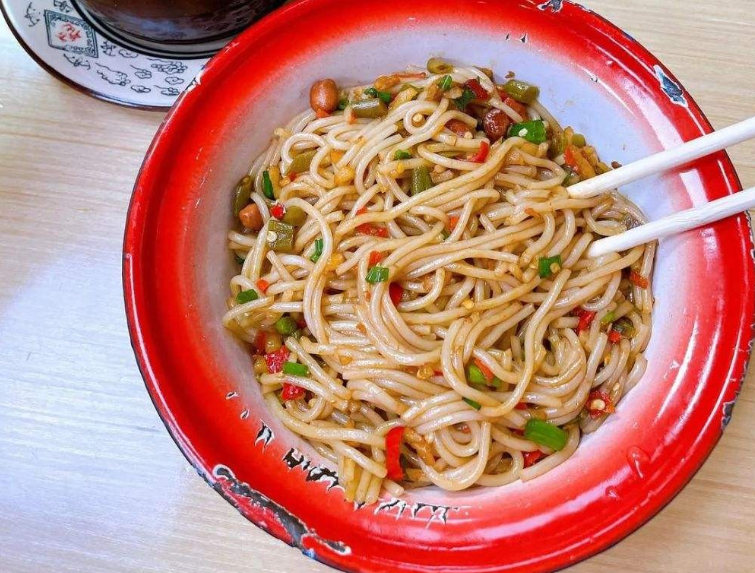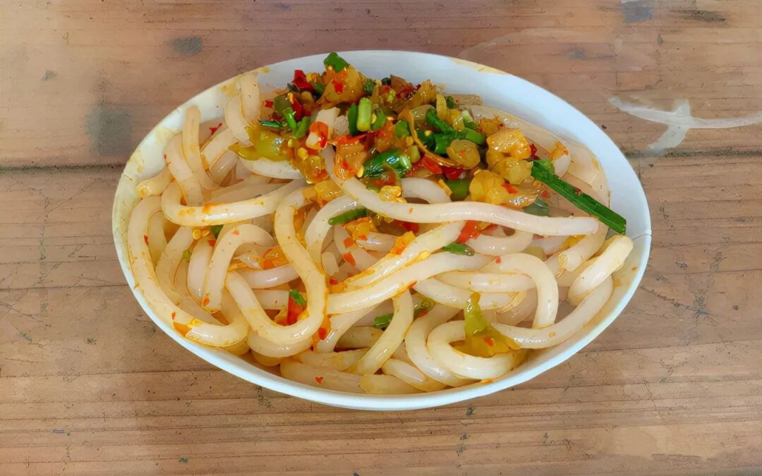 将粗大的米粉放入辣椒,萝卜丁,榨菜丁加入橘子皮,食用盐,生抽等调味品搅拌均匀入味,最后撒入葱花,一碗景德镇最具特色的冷粉就做好了。
