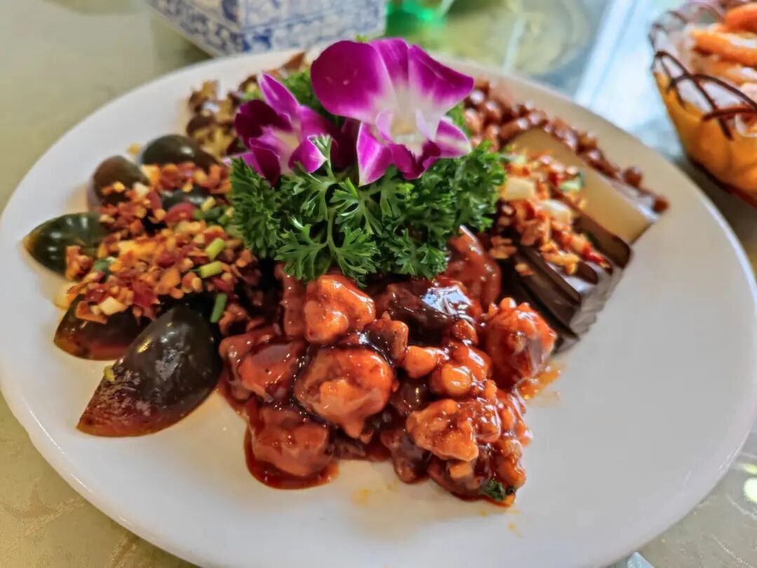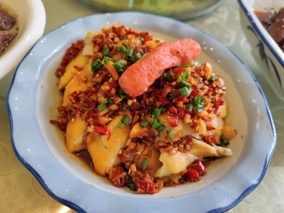 白切鸡上面铺满了辣椒,上面还放了一个红色的炸豆腐,同桌的宾客介绍道,这是江西特有的习俗,将红色的油炸豆腐放在菜品上,点缀菜品的同时寓意:喜庆之意。