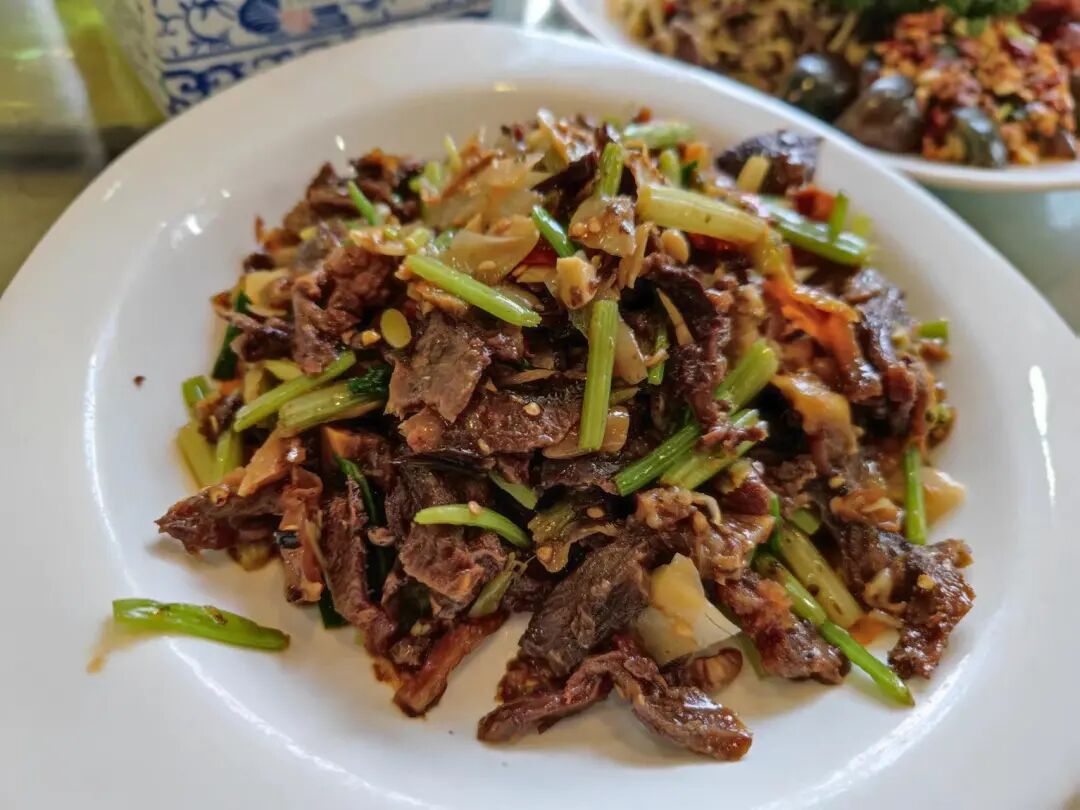余根晖很喜欢吃牛肉,在宴席上也有一道牛肉,只是这道牛肉的做法跟山东菜有所不一样,牛肉和野山椒芹菜一起爆炒。