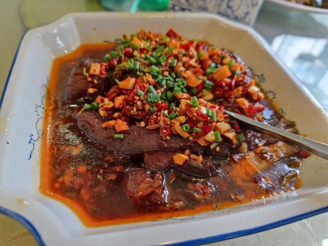 余根晖没想到在这里还能够吃到北方的肘子,只是做法有点不一样,面前的这道红烧肘子,色泽金黄,汤汁看起来都是红油,上面更是铺满了蒜头和辣椒粉。