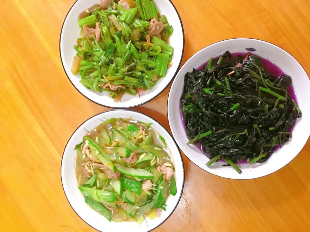 周一的晚餐菜品:空心菜梗炒肉+黄瓜炒肉+红苋菜。