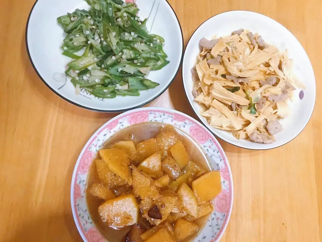 周二的晚餐菜品更简单一点,有清炒秋葵,有腐竹烧肉,有清炒南瓜,三道菜品总计花费不到12元。