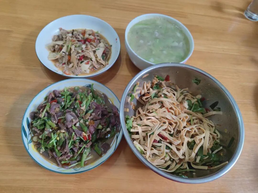 周三晚餐花费16元,三菜一汤:凉拌千张,鸭胗炒青椒,豆腐炒肉,丝瓜猪肉汤。