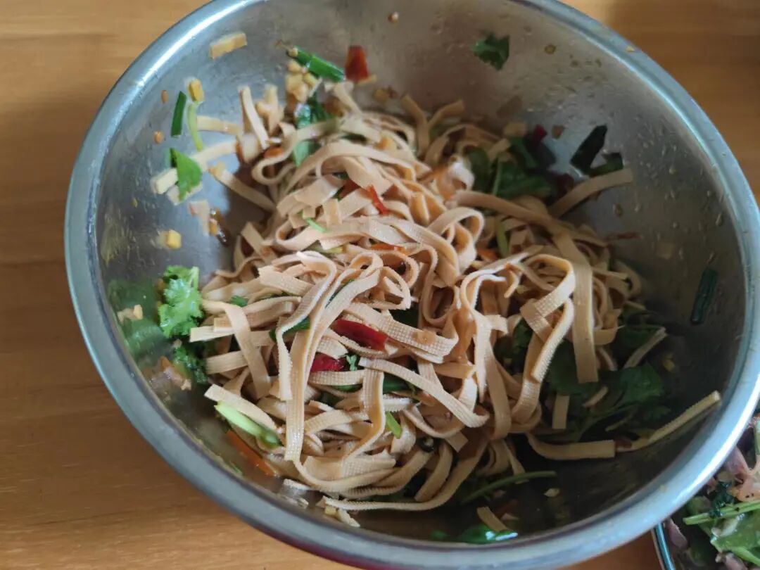 再将辣椒汁倒入千张中,搅拌均匀,一道美味十足的凉拌千张就做好了。