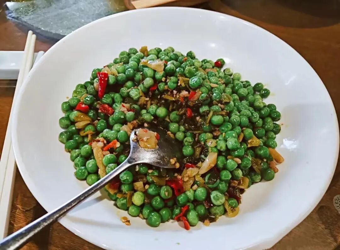 青豆放入冷水中过凉沥干水分,锅内下入小米椒,蒜头炒香,再放入少许酸菜炒香,最后再下入焯水后的青豆,加入食用盐,生抽等调味品,大火收汁便可出锅了。