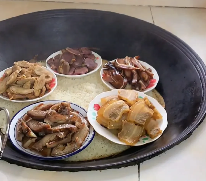 在二舅的土灶台上,摆放着各种各样的特色美食,有江西板鸭,有腊肉,有豆泡炒肉,有炒时蔬,有鸡汤,还有红烧鸡块等。