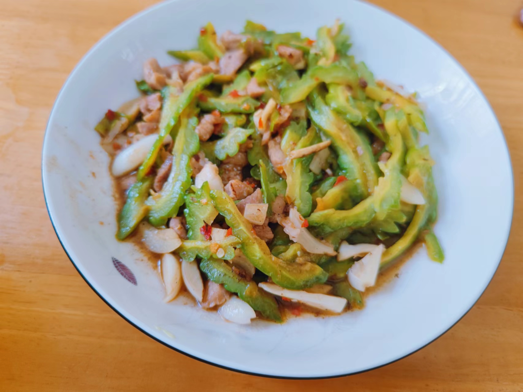 苦瓜炒肉深受婆婆和老公的喜爱,将新鲜的苦瓜切成片,不要放盐去腌制,这样炒出来的苦瓜苦味才够足,吃起来才带劲,猪肉的香味和苦瓜的苦味结合在一起,非常适合炎热的夏天食用。