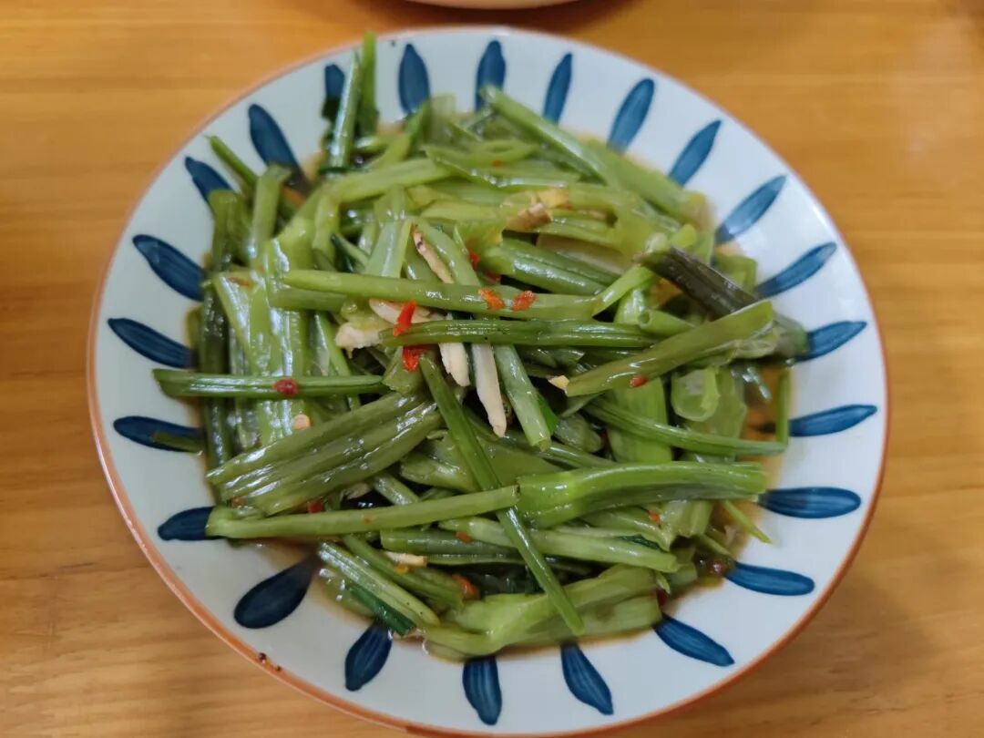 外婆在菜园子里种了不少的空心菜,将空心菜的嫩叶子采摘下来打汤,然后将菜梗留下,切成段,放入锅中和蒜头小米椒一起爆炒,做出来的清炒空心菜梗很有江西风味。