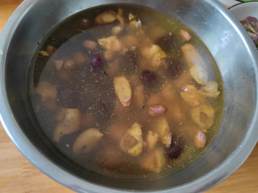 其中有两个汤,一个是女朋友爱吃的土鸡汤,另一个也是女朋友爱吃的丝瓜汤,土鸡是从菜市场买的,将鸡肉切块后放入锅中小炒,然后加入清水煮开,再放入电饭煲里焖了3个小时。