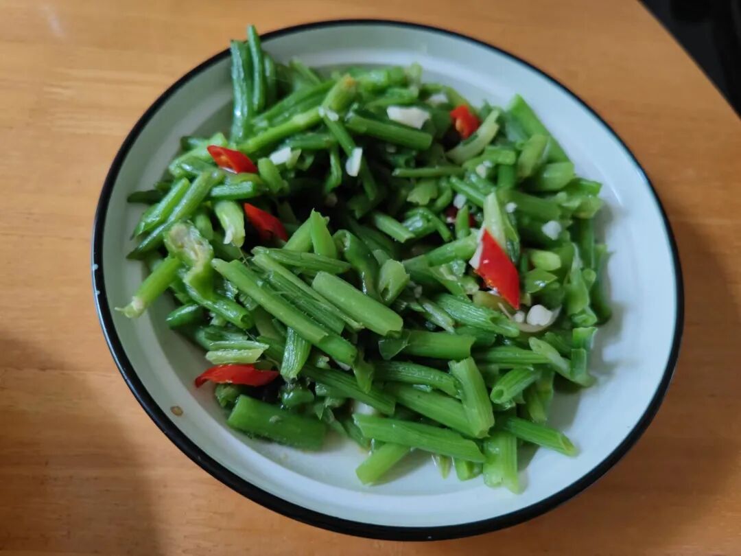将南瓜尖去掉皮,切成段,然后和蒜头小米椒一起放入锅中爆炒,吃起来鲜嫩清爽,比肉还香,但是今晚女友却不知为何对这道菜也没兴趣了。