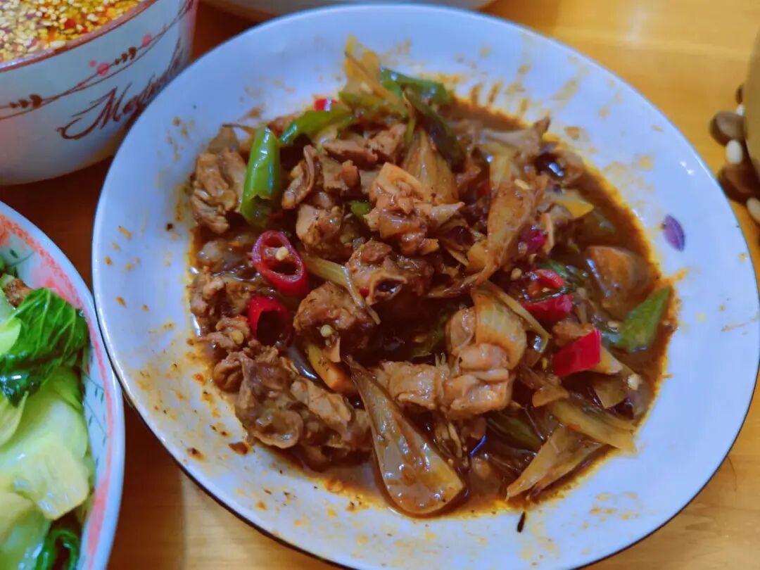 炒出香味后,放入辣椒干翻炒片刻,加入一瓶啤酒,烧开后,盖在锅盖,小火焖煮30分钟即可大火收汁出锅。