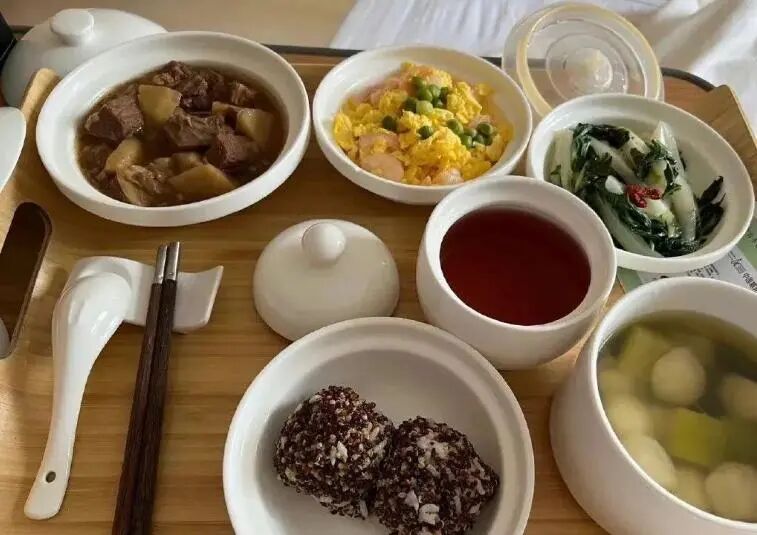 苏晓琴的陕西朋友也晒了一组月子餐的图片,有3个不同的菜,分别是清炒奶油小白菜,炒鸡蛋还有一碗牛肉炖萝卜,一碗鱼丸汤,一份生姜红茶,还有两个主食紫米丸子。