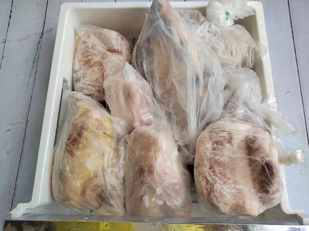 然后将其放在冰箱的冷冻层,包裹得很严实,每个肉都单独包装在一起,这样才不会相互冻住,想吃的时候打开解冻,吃多少切多少,还是非常方便的。