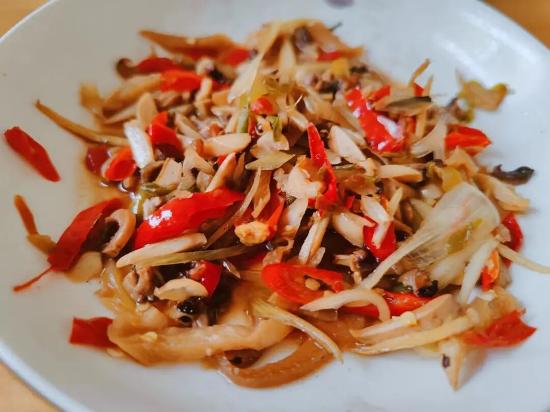 鱿鱼干炒荞头萝卜,这是一道很下饭的菜,鱿鱼干是陆曼婷在网络上买的,在超市一斤超过百元的价格让陆曼婷望而却步了,网上价格实惠多了。