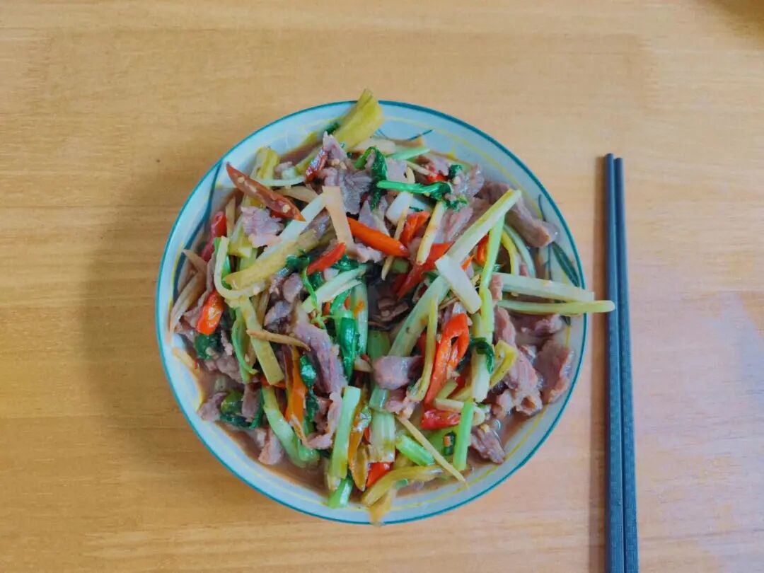 将街上买的芹菜切成丝,猪肉切成肉片,然后菜园里采摘一点小米椒切成片,将猪肉腌制入味,下入锅中炒香,然后在放入小米椒,最后依次倒入芹菜等食材,大火爆炒,加入生抽,食用盐等调味料。