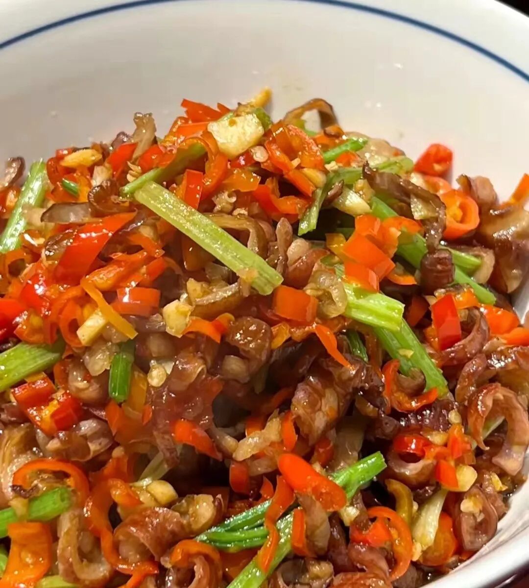 小肠切得很细,放的辣椒并不是只有一种,有泡椒,有朝天椒,有灯笼椒等各种辣味十足的辣椒组合在一起,再放入一些芹菜和蒜头,拿起筷子夹了一口吃了起来,太辣了,完全感受不到小肠的风味,嘴巴里全是辣椒的味道。