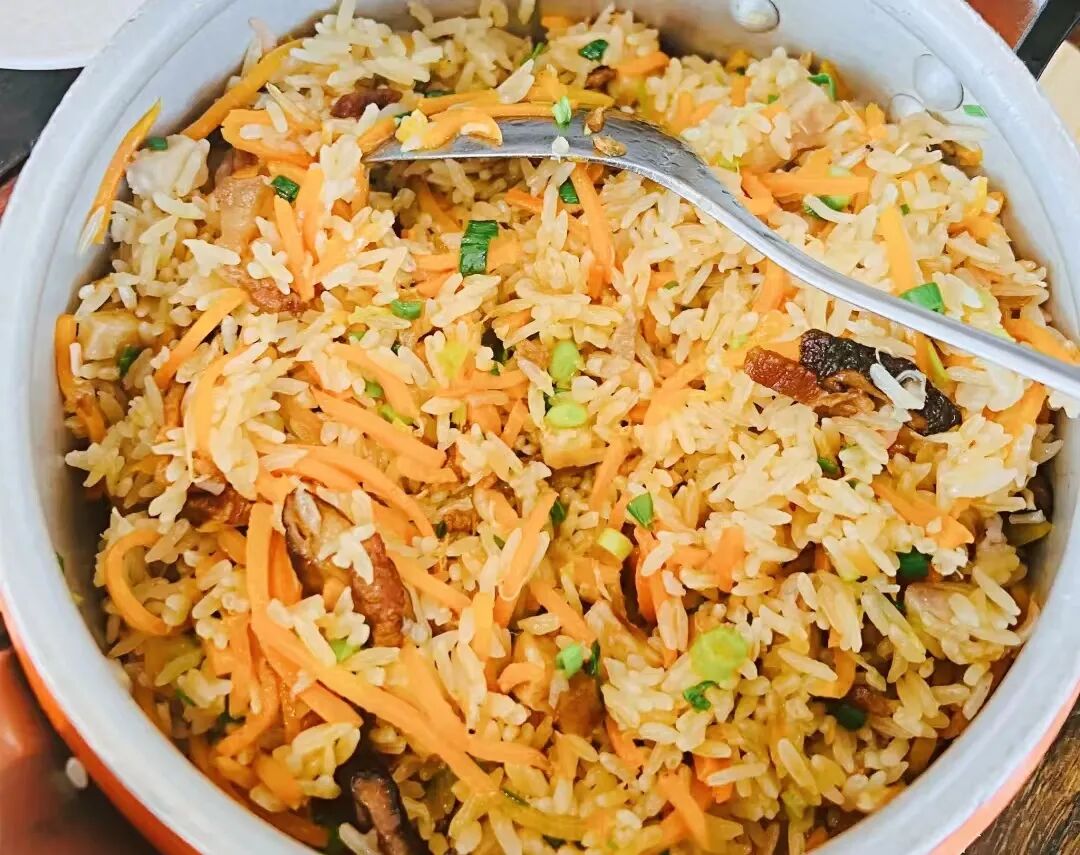 萝卜饭各家的做法都有点不同,有的是有白萝卜切成大块,而这家店使用的是切成细丝的胡萝卜,然后和猪肉,虾仁等食材一起焖煮而成。