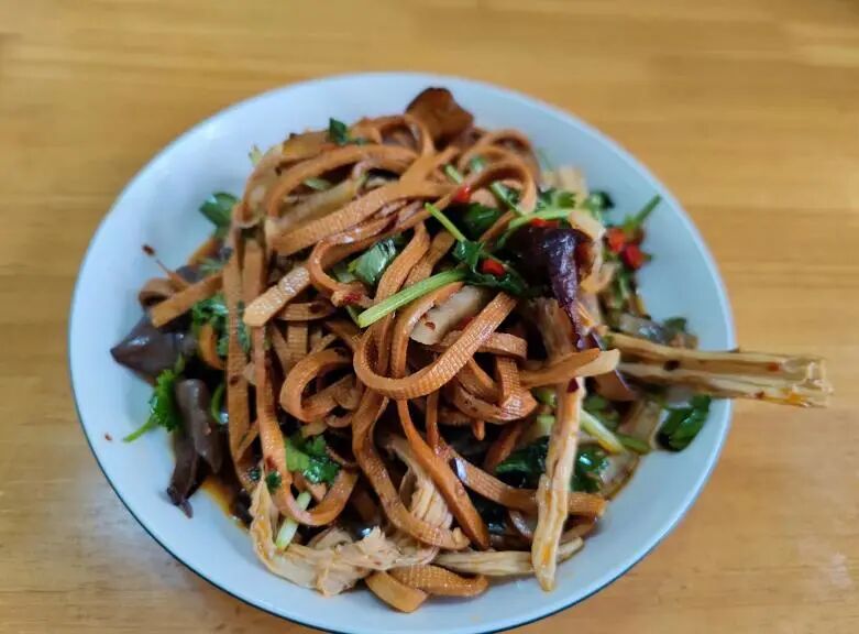 凉拌香干也是王新峰很爱吃的一道菜,为了让菜品吃起来更加美味,王新峰还准备了黑木耳,腐竹,香菜,香葱等各种配菜。