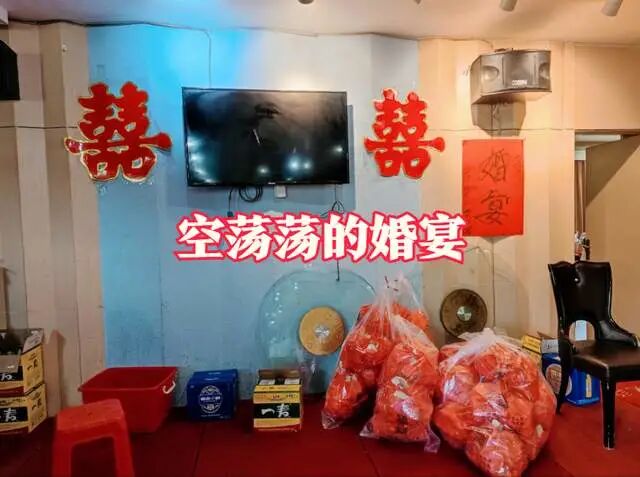 一开始大家都说会来喝喜酒,没想到最后却被亲朋好友们放“鸽子”了,原本预订了50桌,最后只坐了不到5桌,其中4桌来的都是蓝耀诚的直系亲属,剩下1桌是新娘的亲属。