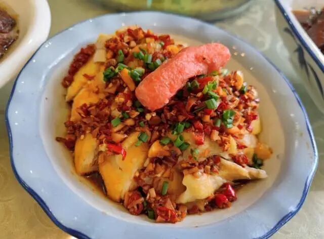在白切鸡上铺满了一层辣椒,香辣爽口的白切鸡,才是江西人的最爱,在白切鸡的上面还摆放了一小块油炸豆腐。