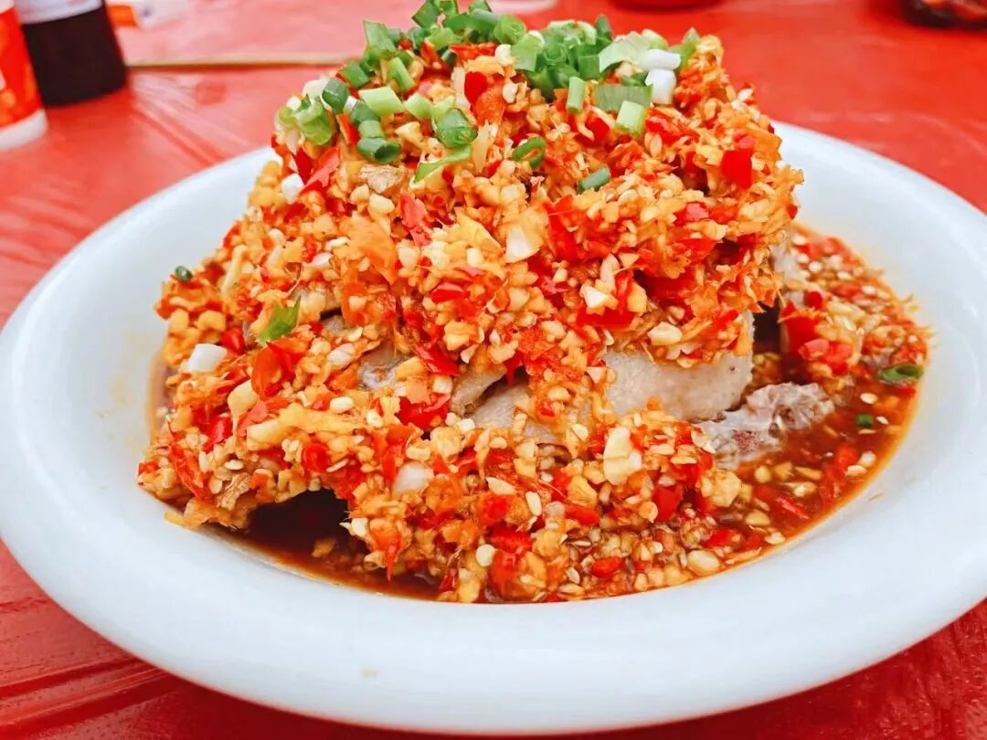一碗白切鸡上面铺满了剁碎的小米椒和蒜蓉,鲜红的颜色,让人一看就辣味十足,外地人可能吃不习惯,但是本地人看到却要流口水了。