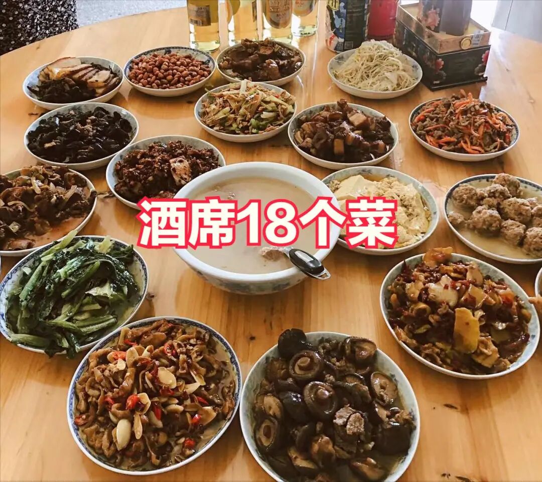 菜品的总数有17个菜1个汤,有鸡鸭鱼肉全都有,按照菜品数量而言18个菜确实属于比较丰盛的宴席菜了,在很多地区,人们宴席菜一般都是12道一个汤的标准。