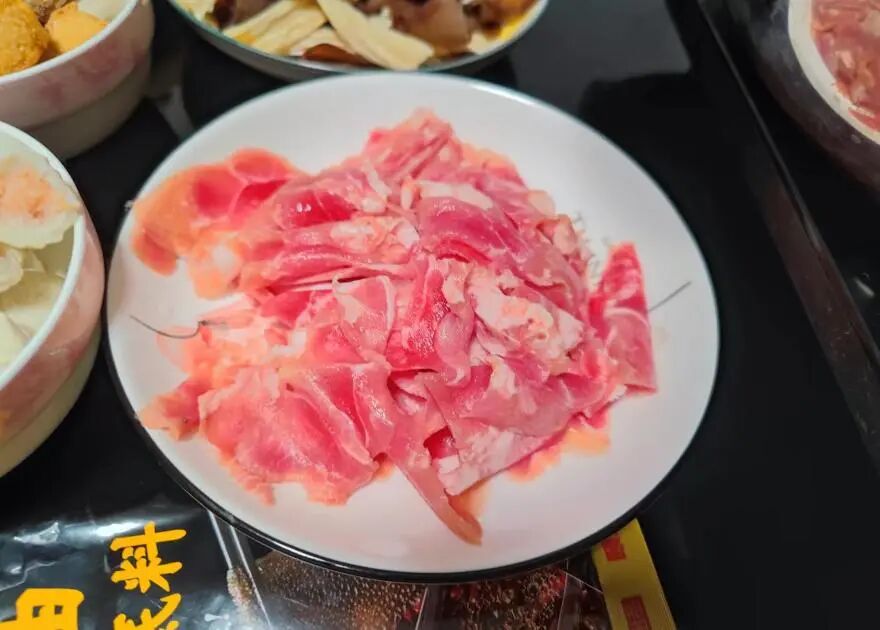 吃火锅还是得有肉的,李秀英不喜欢超市冰柜里的那种羊肉卷,喜欢买新鲜的肉放在冰箱里冷冻,然后吃火锅时便拿一点出来用刀切成片,这样切出来的羊肉卷更加美味。