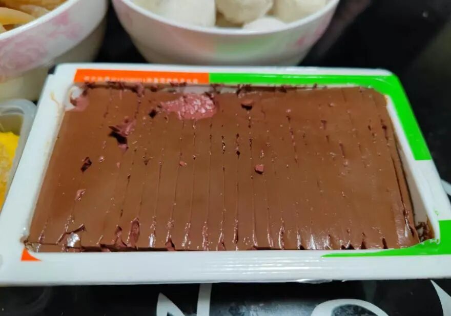 鸭血是李秀英一家四口口都很爱吃的火锅食材,2块钱一盒,将鸭血清洗一下,然后用小刀切成块状,将其放入到辣锅里,鸭血非常的吸味,而且久煮不坏,不需要担心煮着会消失,也不需要担心不入味的问题。