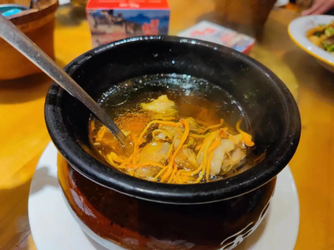 虫草花土鸡汤是用砂锅小火慢炖出来的,味道鲜美,汤汁不油腻,小姨和同事们都很爱喝,一道汤上桌后,转一圈下来就被大家吃完了。