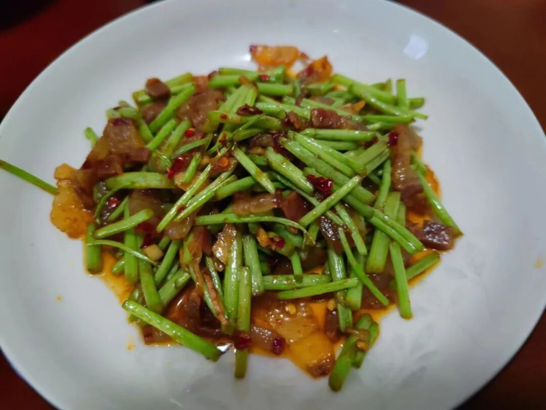 出锅后的藜蒿色泽青绿有光泽,腊肉的独特香气配合着藜蒿独有的气味,二者混合在一起,一口吃下去简直就是人间美味。