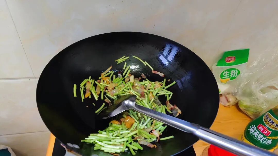 炒的时候加入少许辣椒粉,生抽,蚝油,食用盐,此时要注意放盐的时候不要放太多,因为腊肉本身就是咸味很重,放盐太多的话这道菜咸的发齁就没法吃了。