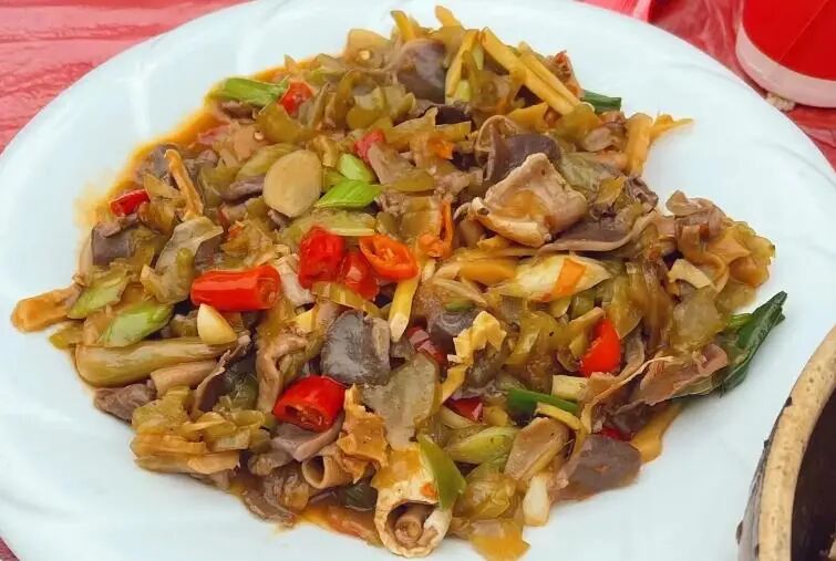 这里的大肠选用的是花肠,里面还放了少许鸭胗进去,酸菜选用的是本地农家腌制的菜梗,豆角,萝卜等配料。