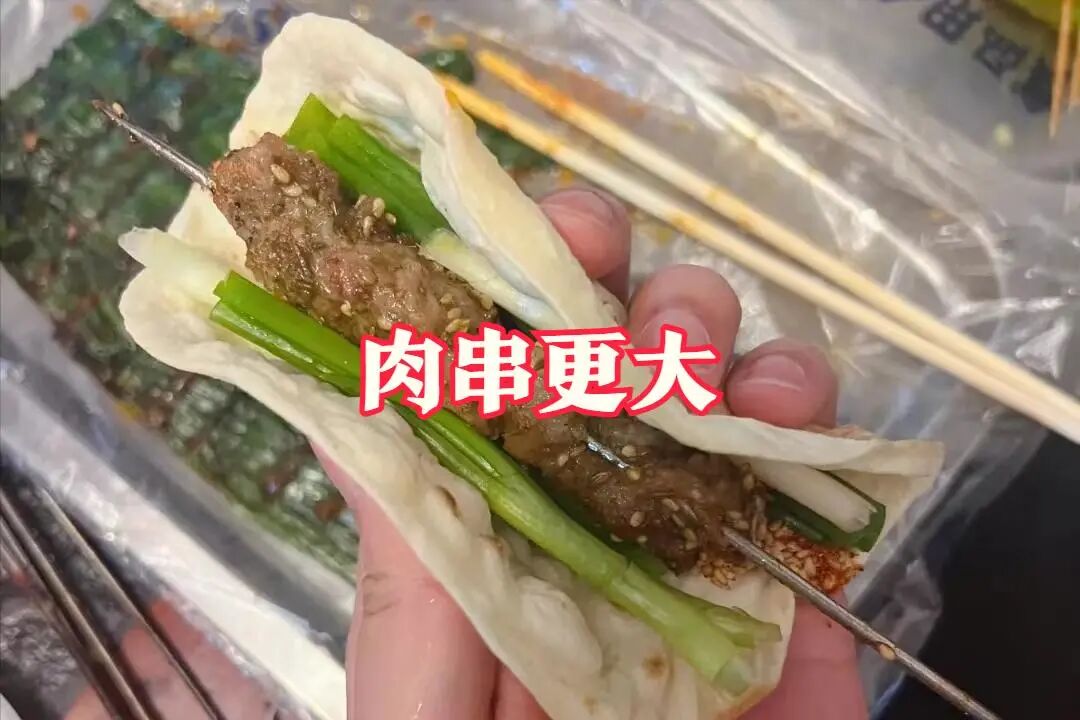 而在这里羊肉串也是四五粒左右,但是肉串会更大,而且中间不会掺杂羊油进去,全是羊肉,新鲜的羊肉烤出来的味道,跟冰冻的羊肉烤出来的味道完全不一样。