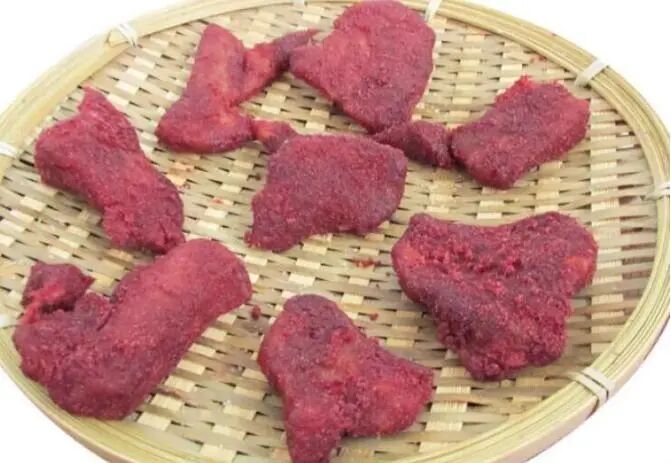 将新鲜的猪肉切成片,要厚一点,然后在猪肉中放入食用盐,味精腌制1小时以上,最后将腌制好的肉片沾上红曲粉,然后放入蒸锅中上汽蒸熟即可。