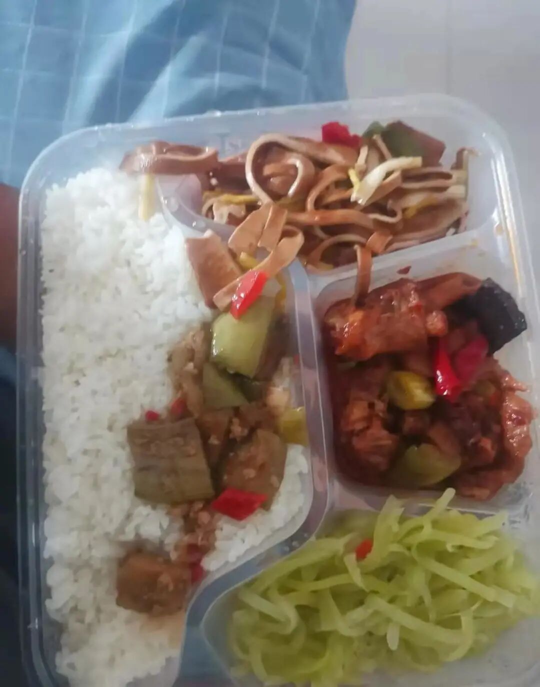 到了中午十二点,酒店派人送午餐来了,早上没吃饱的陈金明早就肚子饿了,打开午餐盒饭一看,这酒店隔离餐也太寒酸了吧?