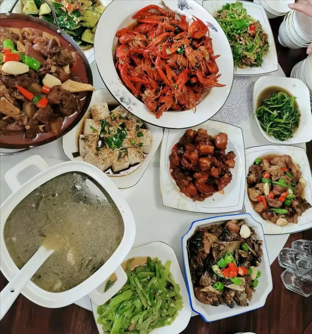 有6位朋友来了家中聚餐吃饭,总共8个人吃饭,丈夫准备了12个菜一个汤。在江西而言12菜一汤算是超高规格的家宴了,有凉拌菜:拍黄瓜和香菜拌牛肉。