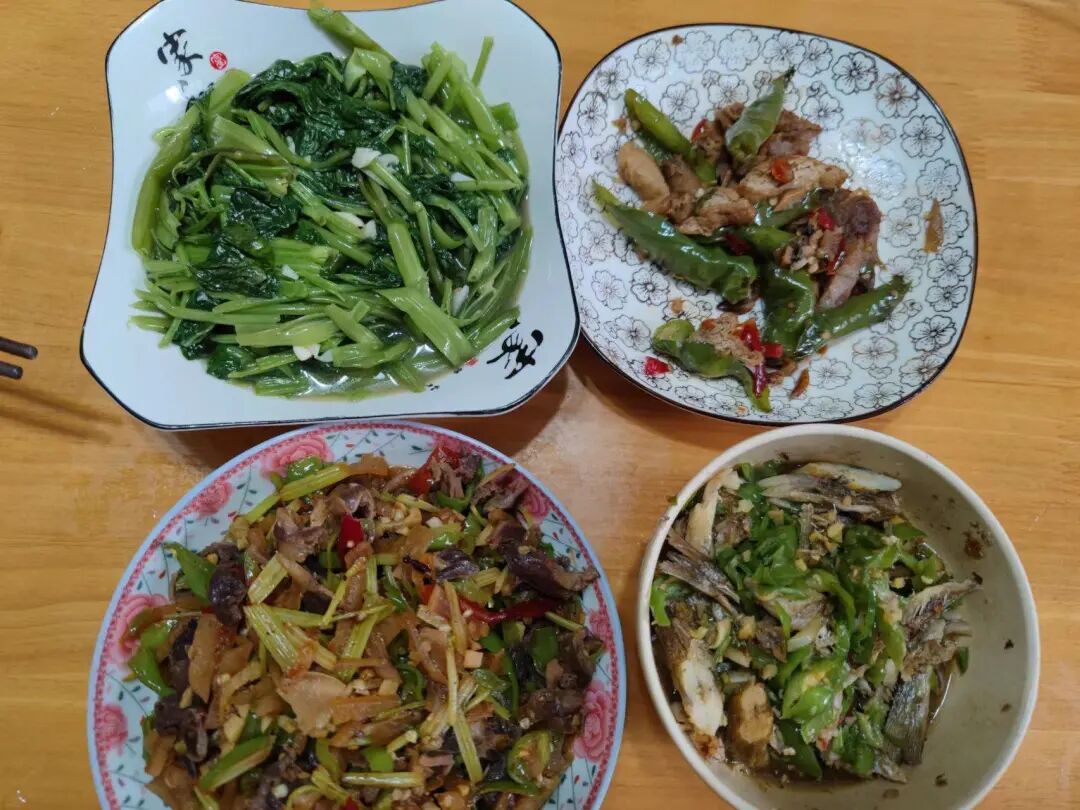 第三天晚餐:清炒空心菜+青椒炒鱼干+酸菜炒鸭胗+辣椒炒肉。