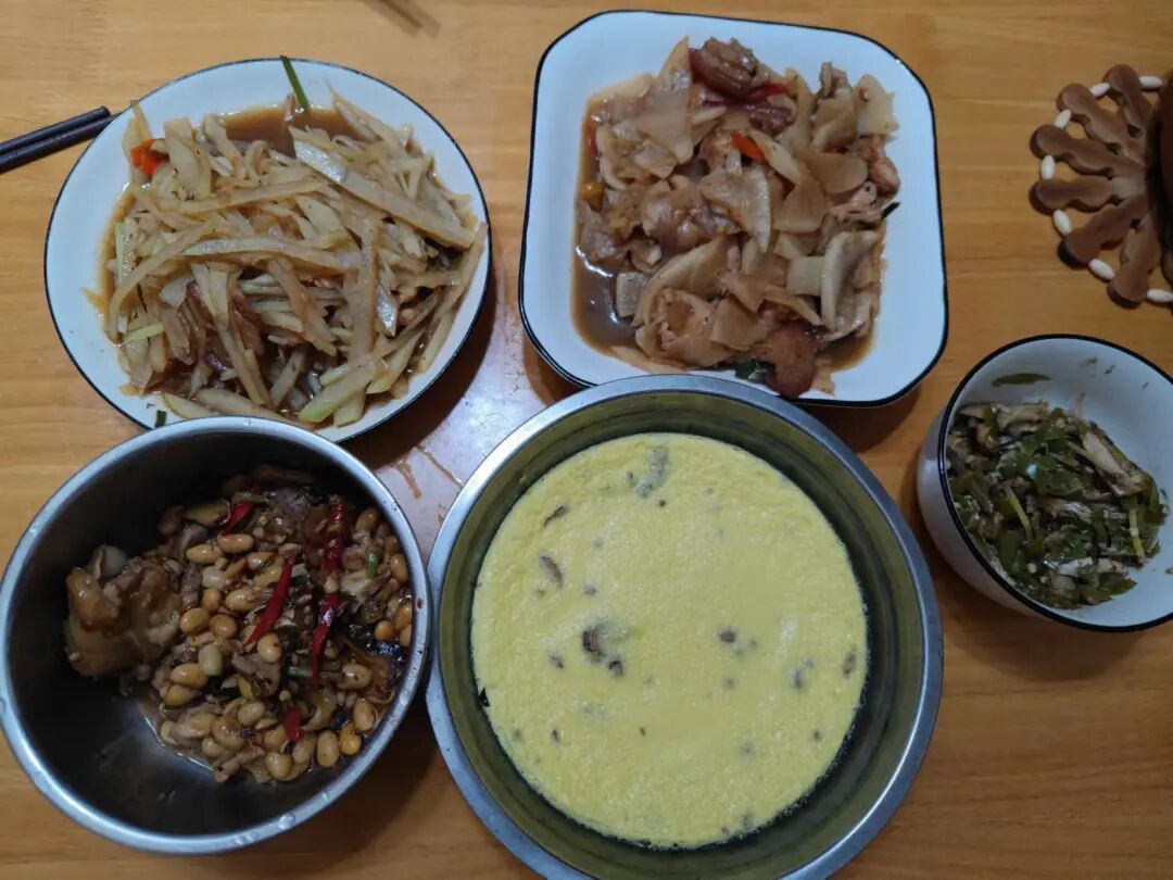 第二天晚餐:蒸蛋+猪蹄焖黄豆+酸辣土豆丝+萝卜炒肉+青椒鱼干。