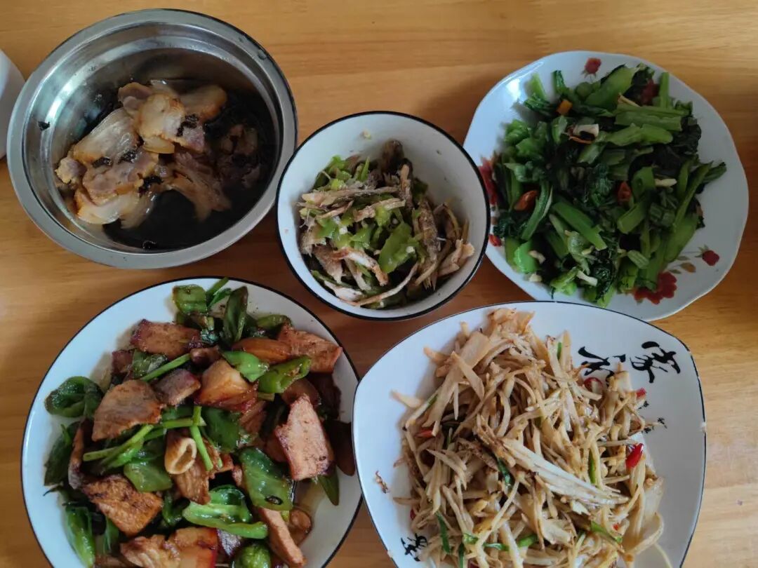 周四晚餐:腊肉+青椒炒鱼干+辣椒炒肉+金针菇炒肉+清炒时蔬。